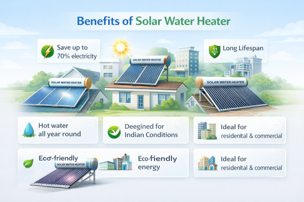 Switch to eco-friendly solar water heating solutions designed to meet the daily hot water needs of Indian households. Our solar water heaters deliver reliable performance for bathing, kitchens, and commercial use—while significantly reducing electricity costs.
